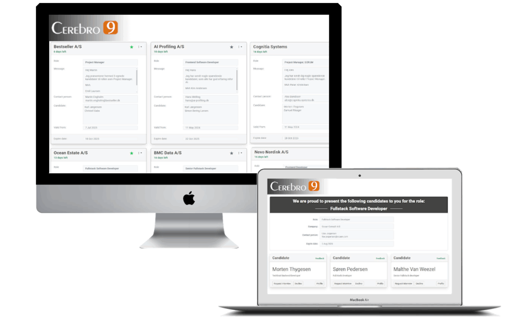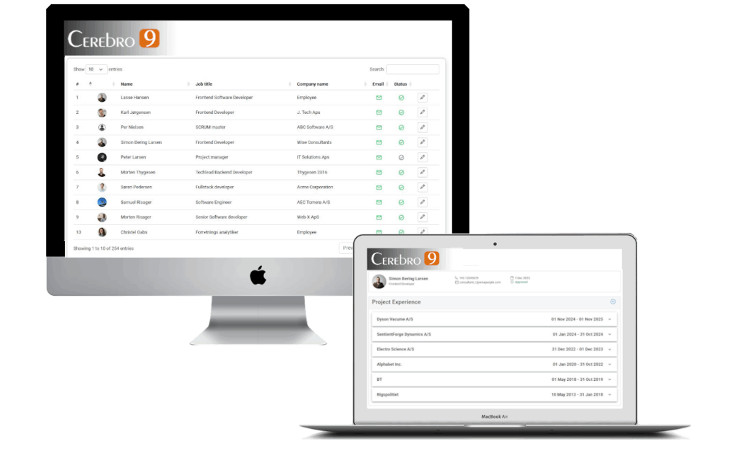 Cerebro 9 helps companies manage their consultant and employee workforce towards customers, maintain up-to-date CVs, and handle daily tasks like customer tracking and candidate presentations — all in one place.